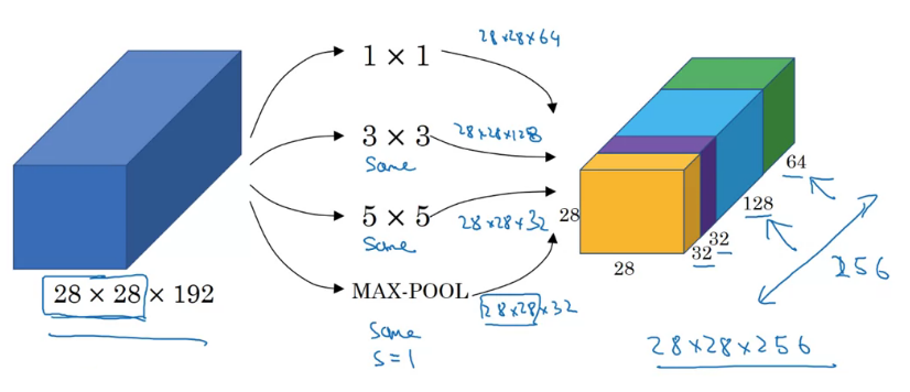 이 과정이 하나의 inception module을 만드는 과정이고, inception network는 이 모듈들의 조합으로 구성된다